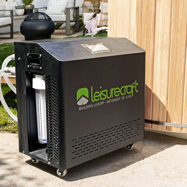 Experience cold plunge therapy with The Arctic Cold Plunge Tub that is manufactured in Canada by Leisurecraft to match the same quality of your sauna or hot tub. The white plastic shell is cut and welded with HDPE plastic and comes with a cedar skirt held in place by the stainless steel bands. Fill this tub with cold water or buy the optional chiller unit which has a built in ozone filter for ease of mind cold tub therapy. The solid cedar cover and steps are included and the Arctic Cold Plunge Tub comes completely assembled and ready to use!